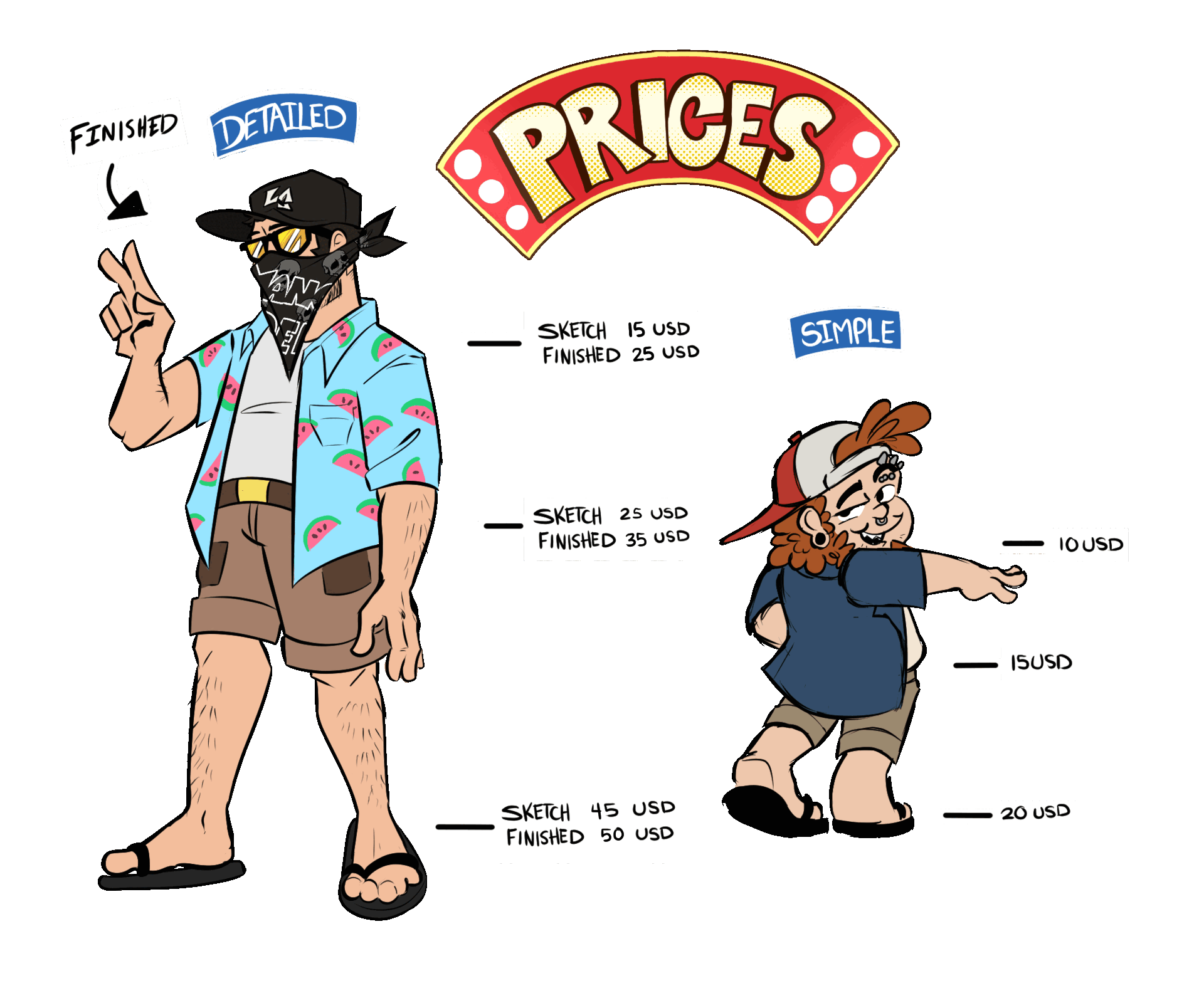 TermsBefore you commission me I expect you have read my terms of service.ReferencesPlease provide me a picture w/ colors of what you'd like!I also accept character descriptions and I can whip up a few sketches for you based on what you describe to me.What will I draw?Tv characters/Game characters